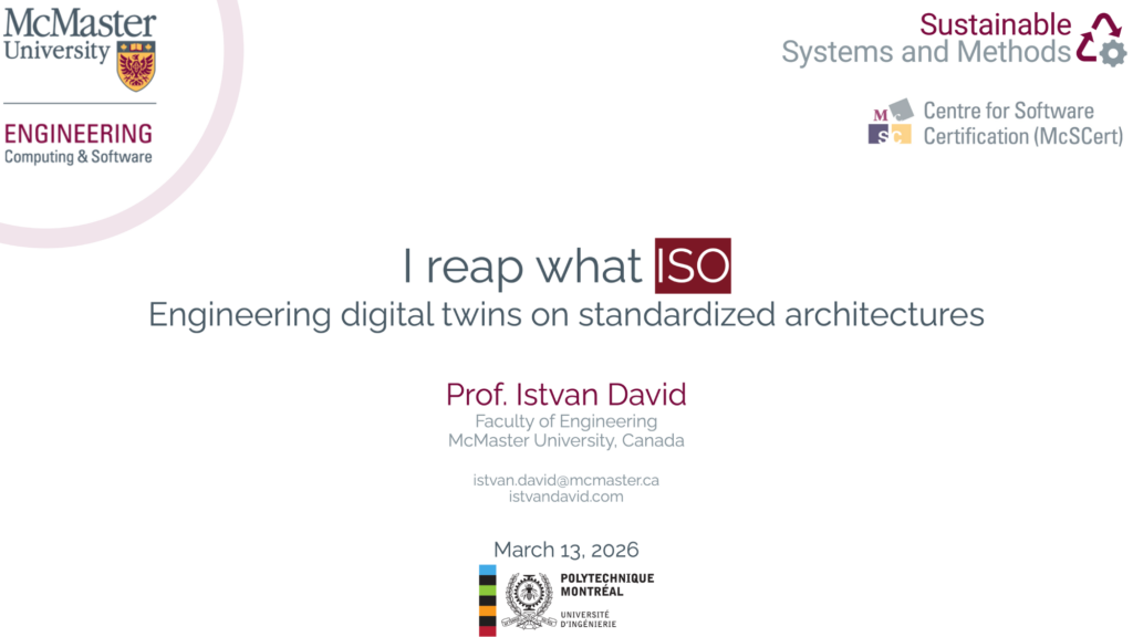Bio: Dr Istvan David is an Assistant Professor in the Department of Computing and Software, Faculty of Engineering at McMaster University. His research is centered around modeling&simulation, machine learning & AI, and the application of such foundations in the design of complex heterogeneous systems, such as digital twins and cyber-physical systems. Dr David is an award-winning author, reviewer, and organizer of flagship scientific events in his communities. Occasionally, Dr David likes to pretend that he’s an engineer.